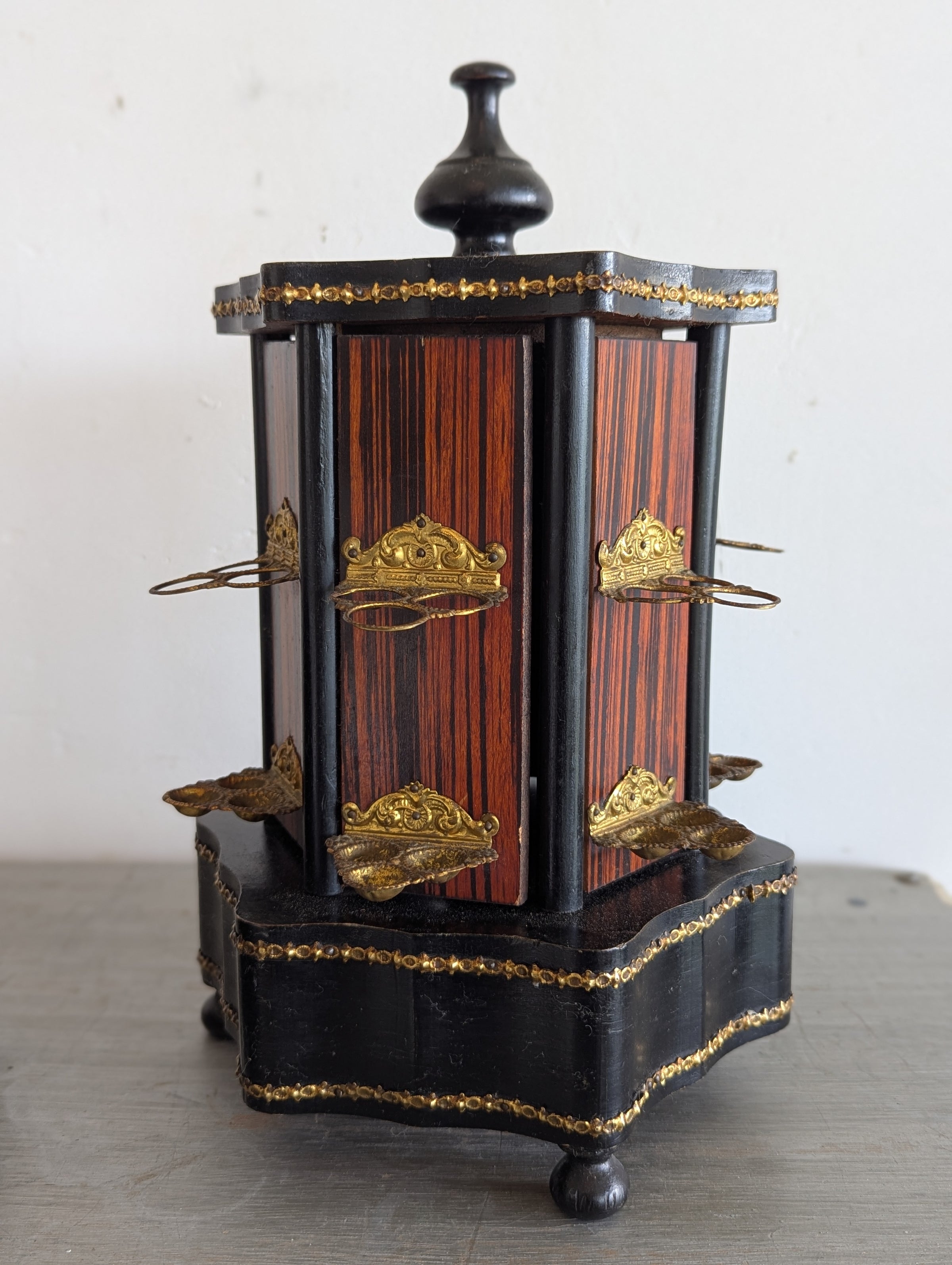 Cave à cigare musicale tournante en bois noirci à décor métallique en applique de frises de perles et de lyre, elle ouvre à 6 volets actionnés par une toupie, base hexagonale chantournée renfermant le mécanisme musical, H. 29 cm (avec une clé).