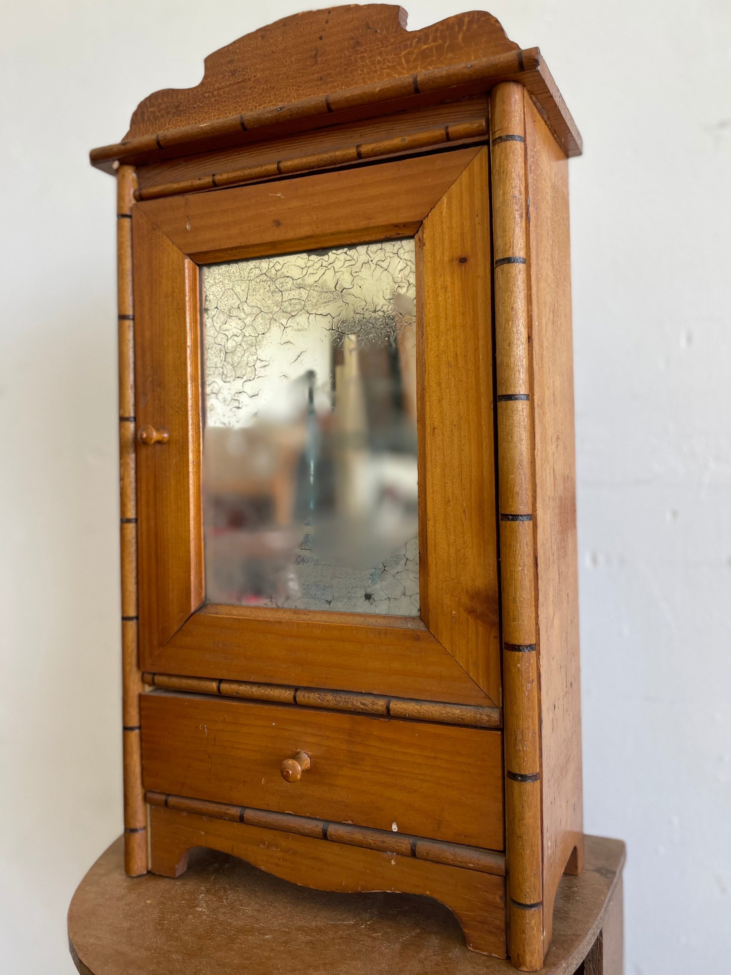 Meuble de poupée en bois verni composé d’une porte avec miroir et d’un tiroir.