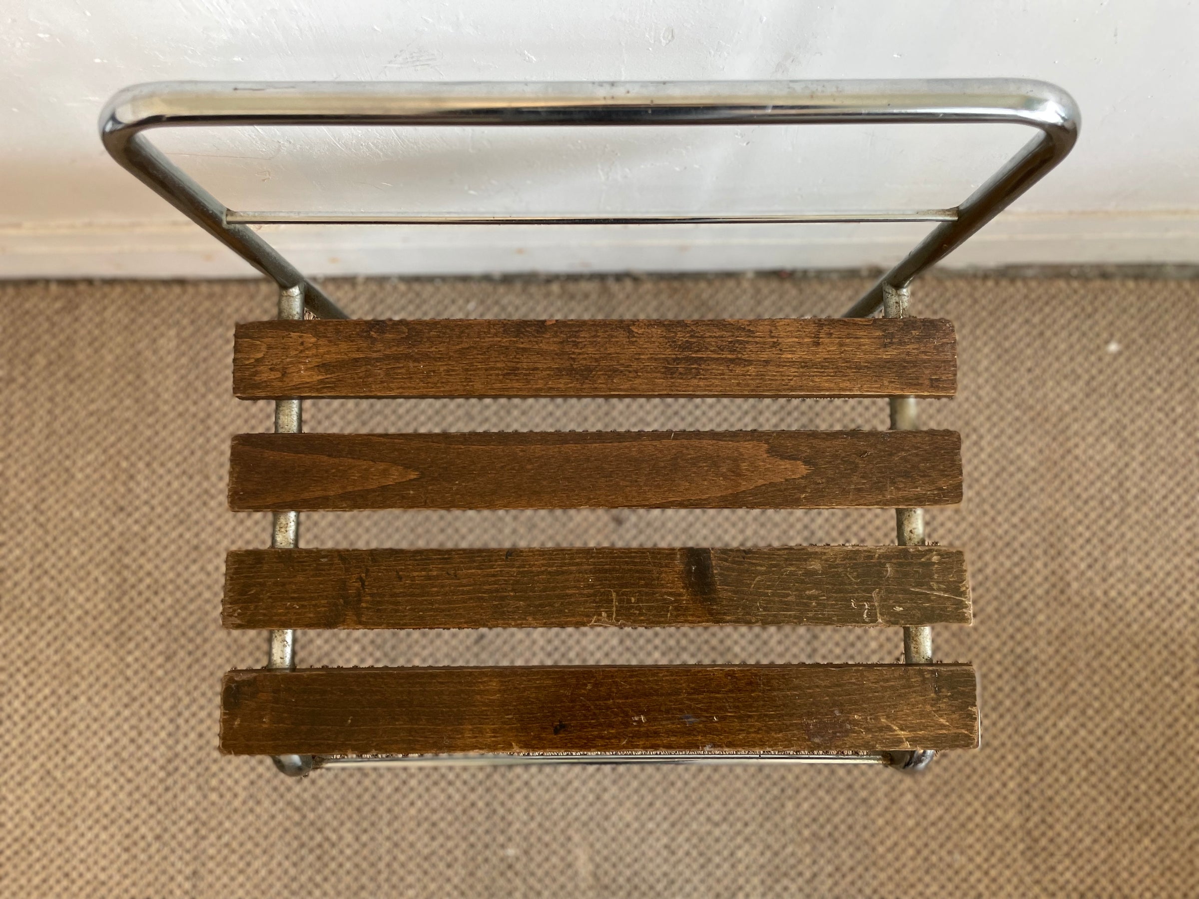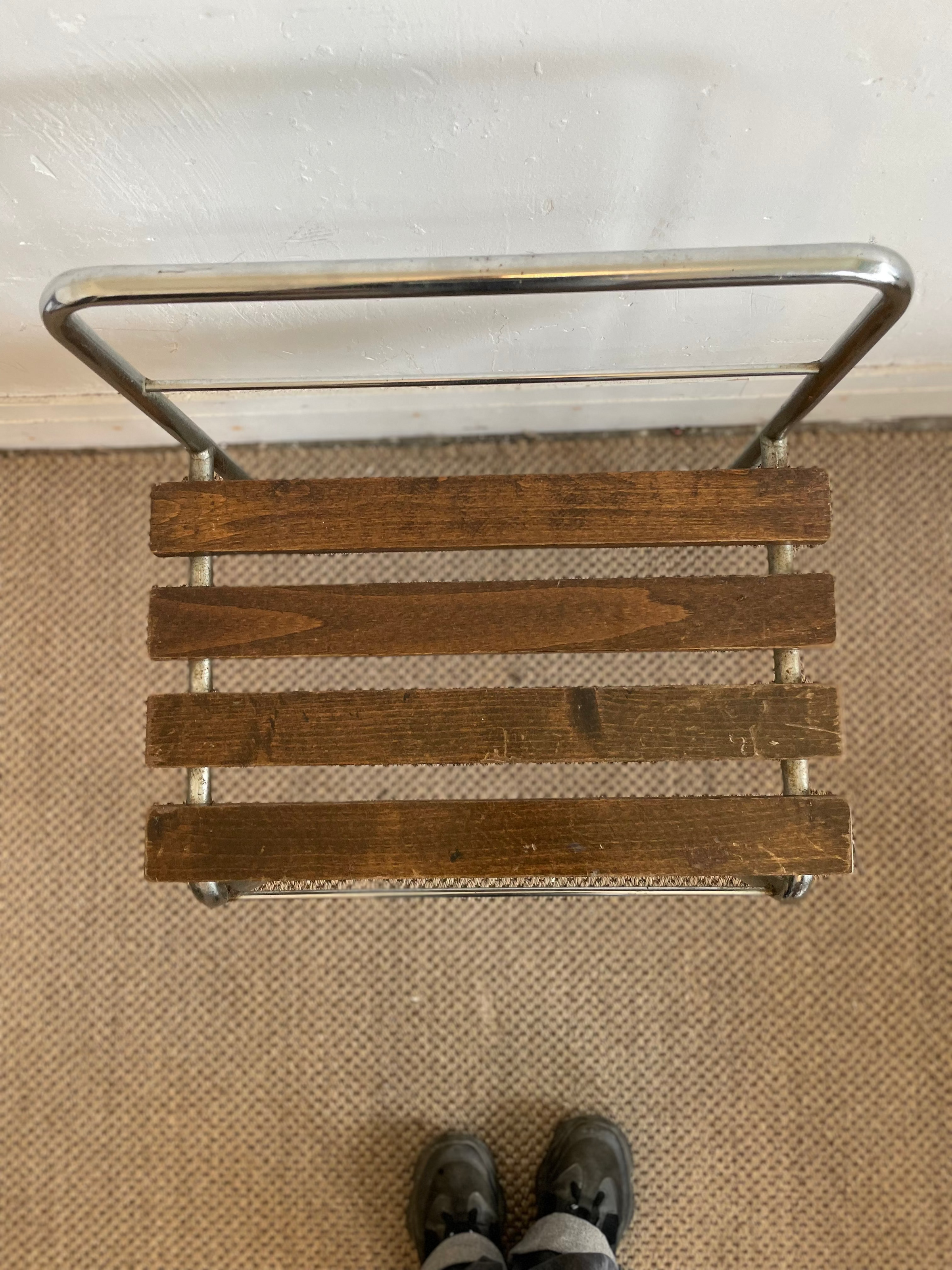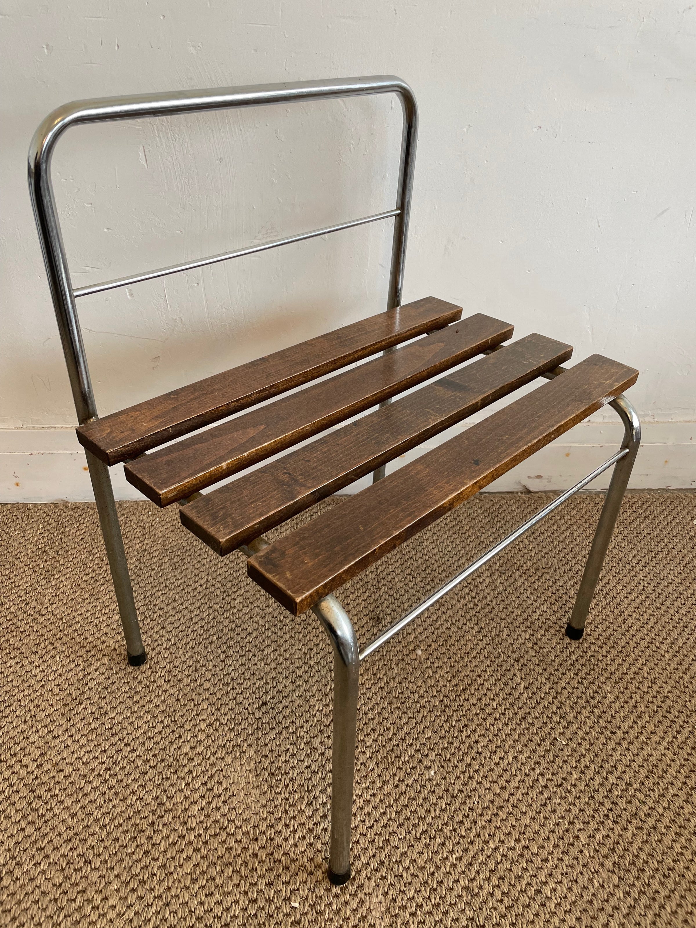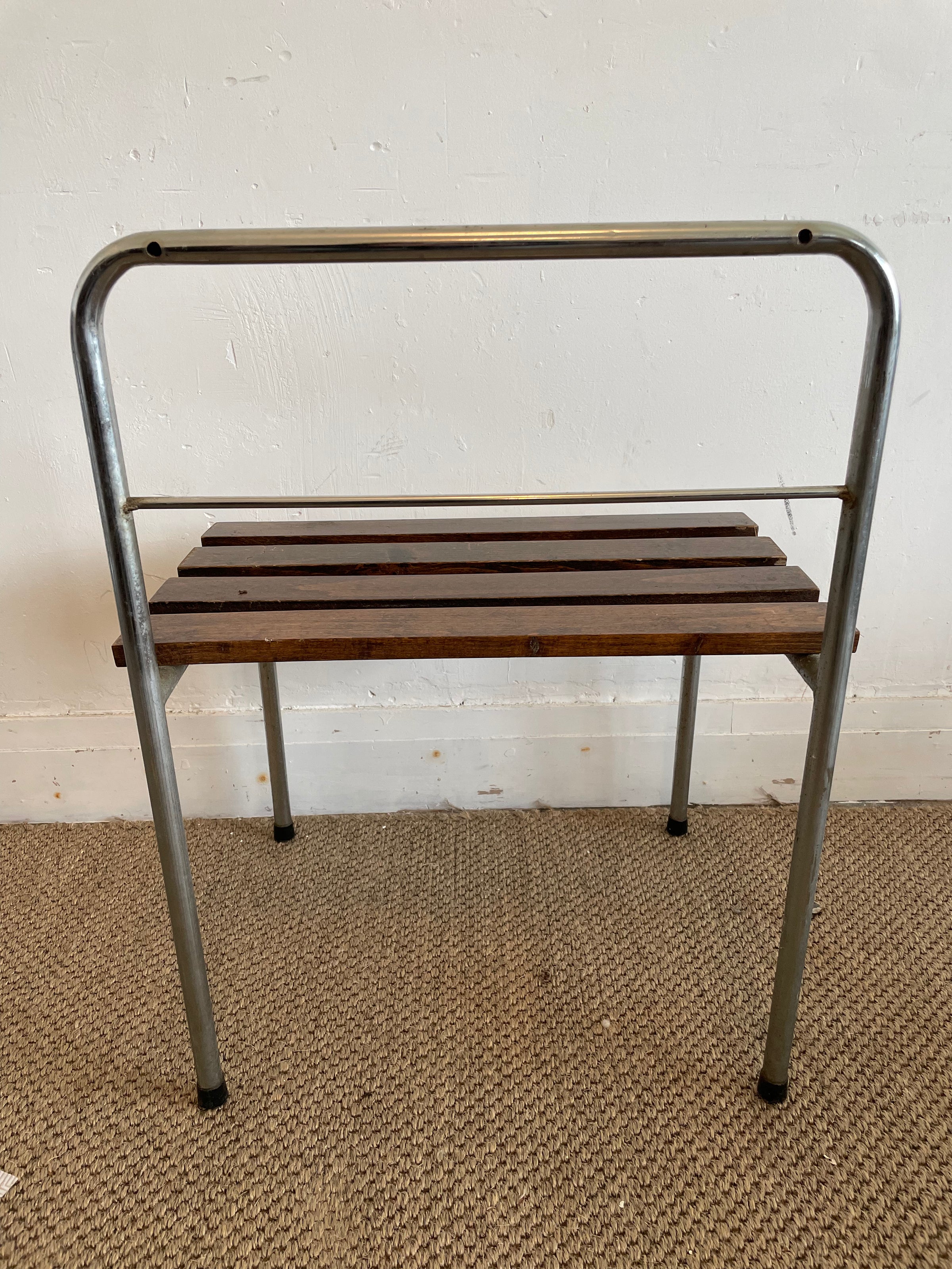 Porte-bagages vintage avec lattes en bois et pieds en métal. Il peut être détourné de sa fonction première pour devenir un bout de canapé, une chaise, etc.