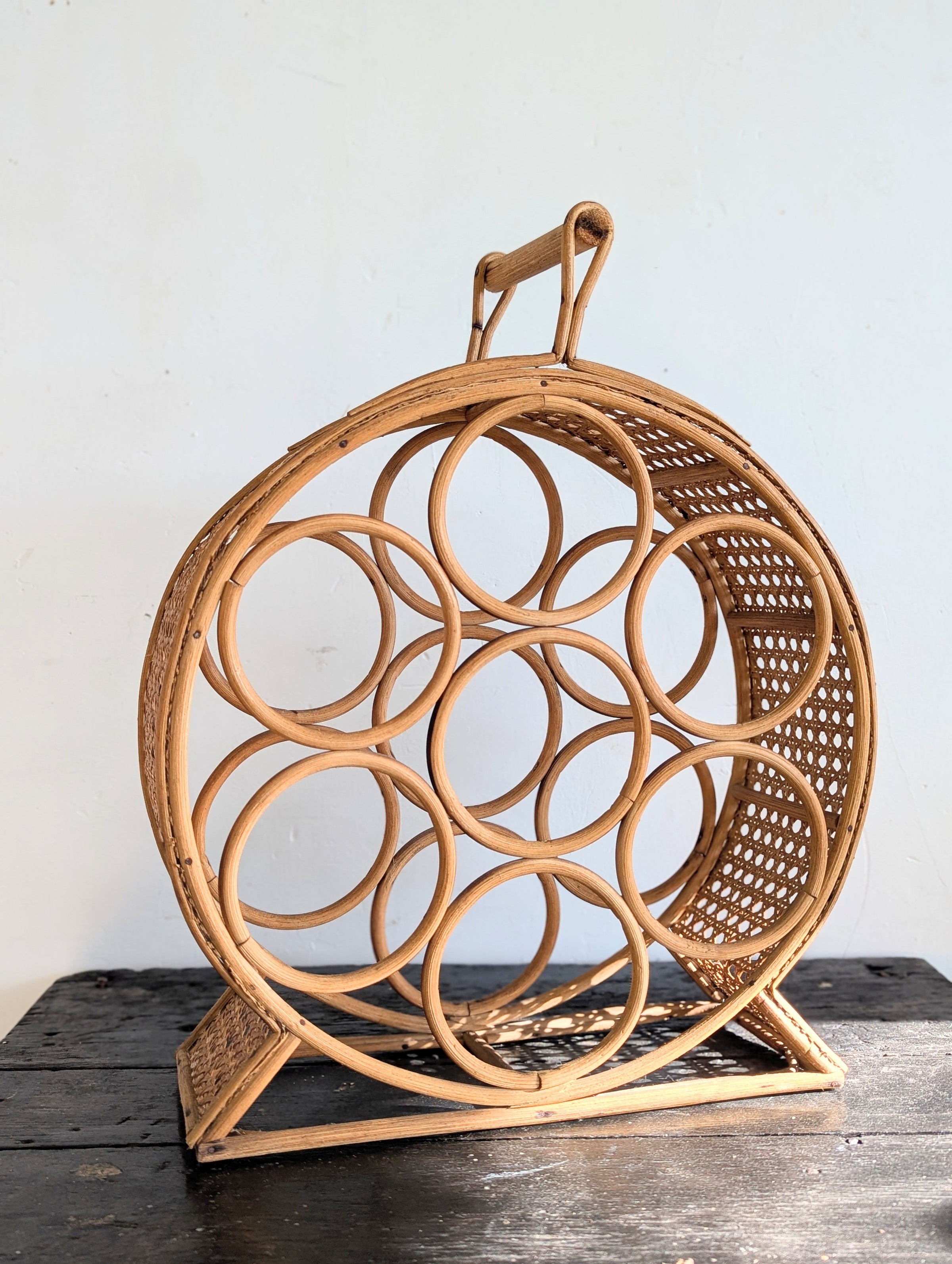 Porte bouteilles vintage en rotin avec cannage sur la circonférence