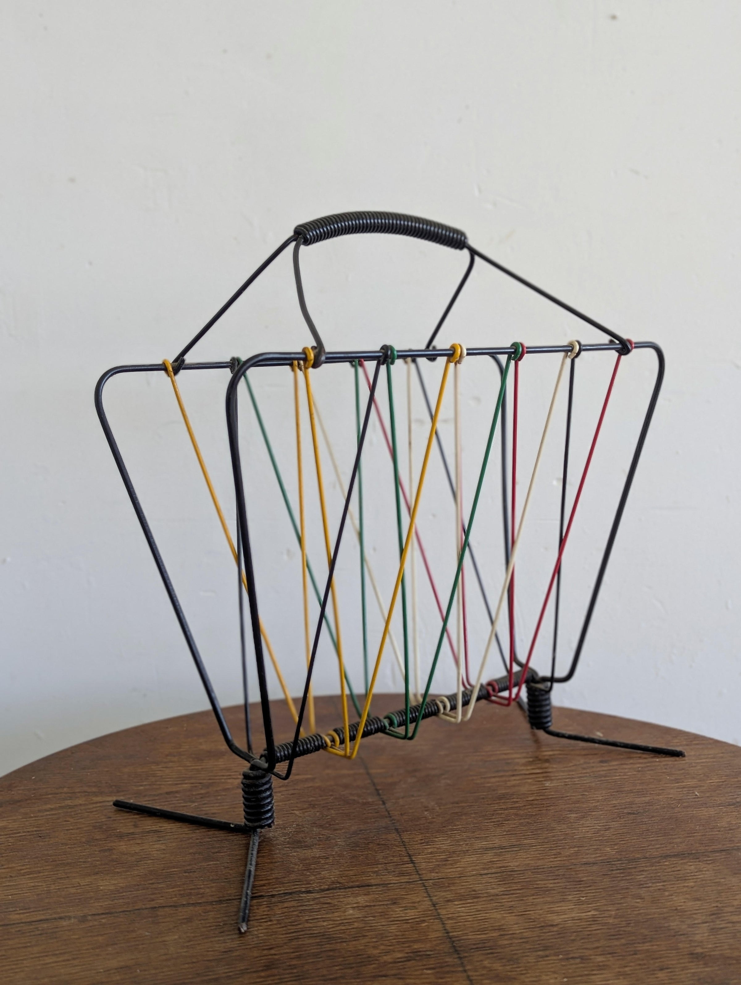 Porte revues des années 50/60, structure en métal et fils colorées type scoubidou qui forment un motif géométrique.