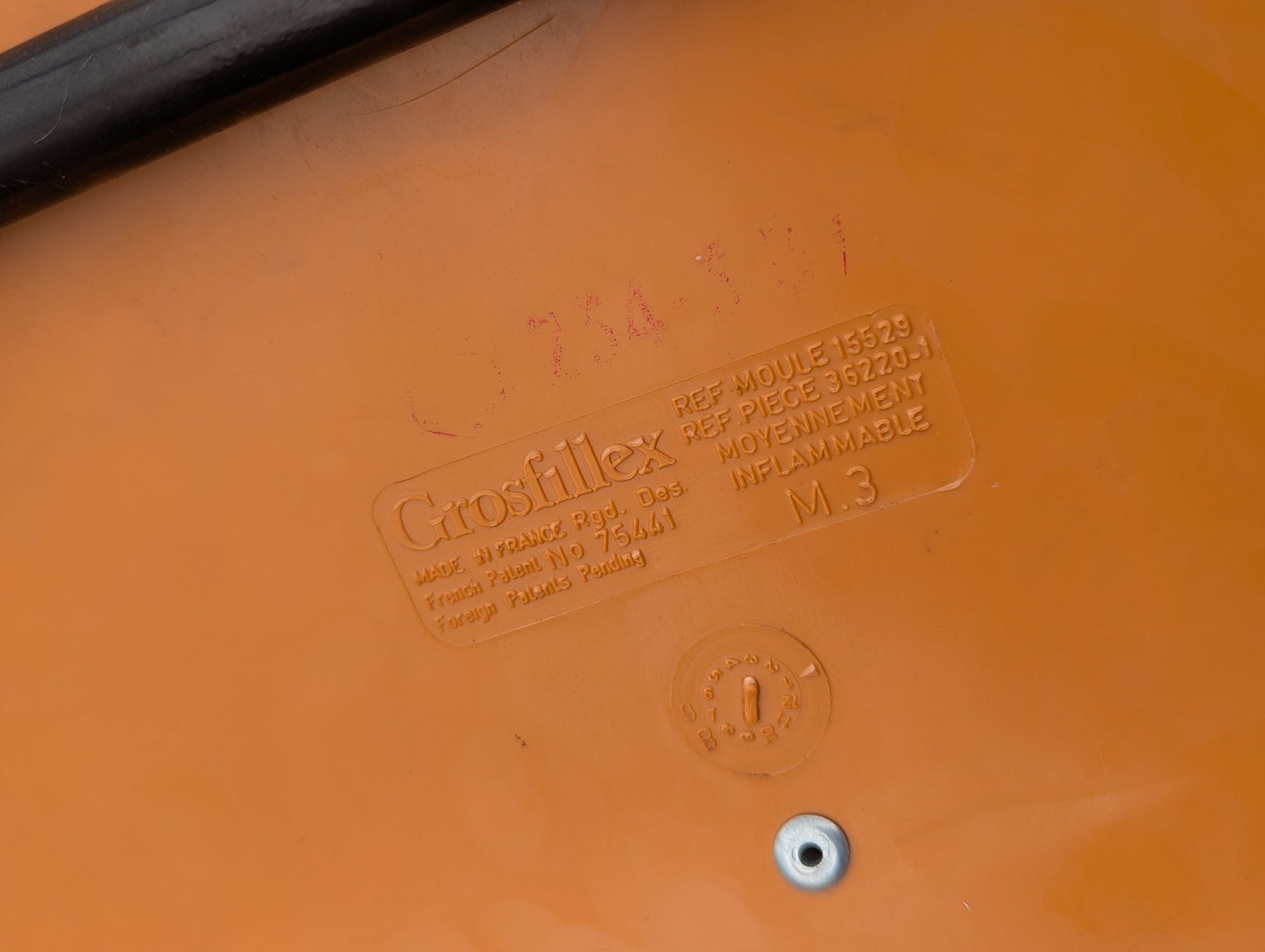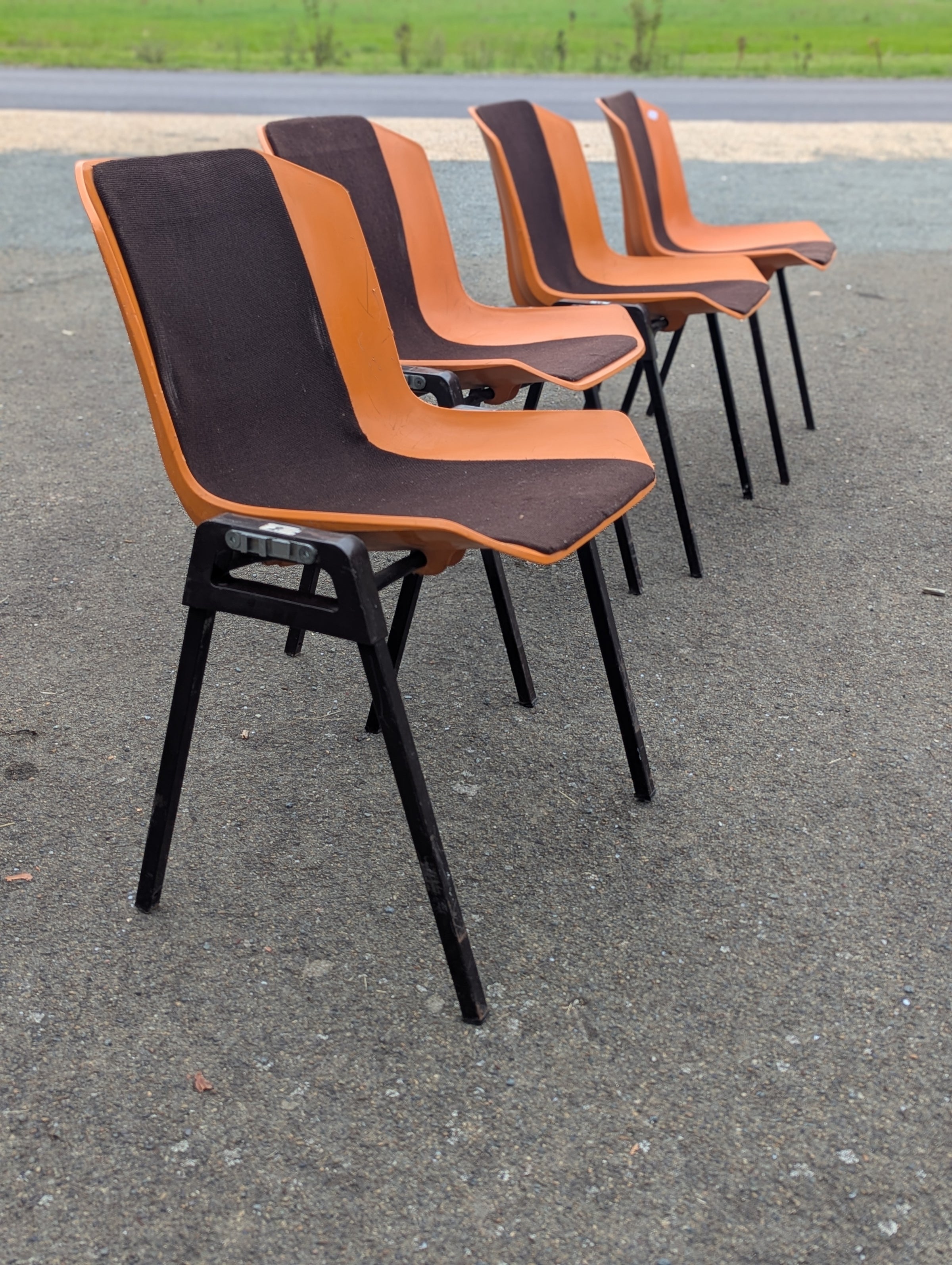 Quatre chaises Grosfillex par Albert Jacob, structure plastique orange et piètement en métal.