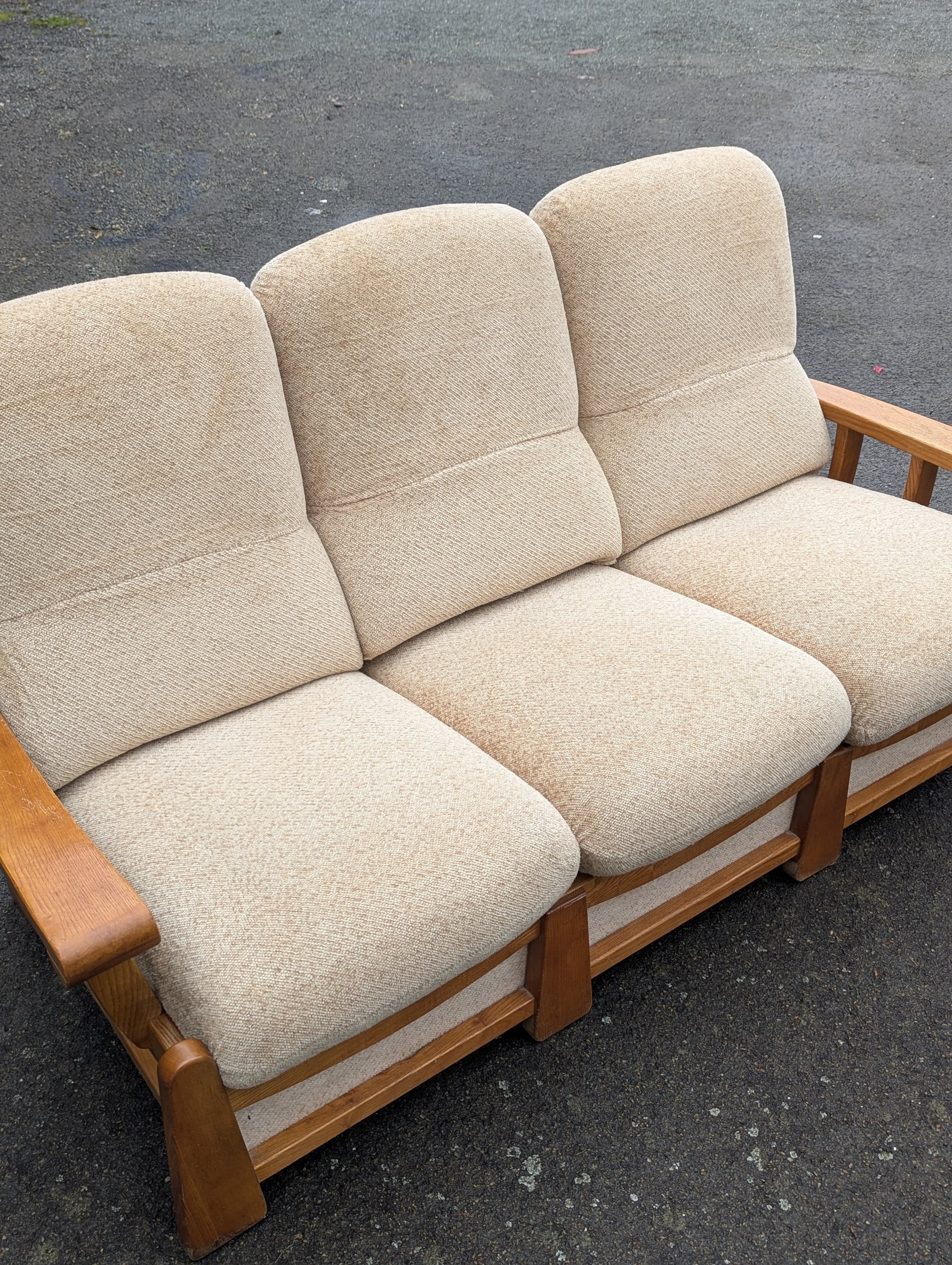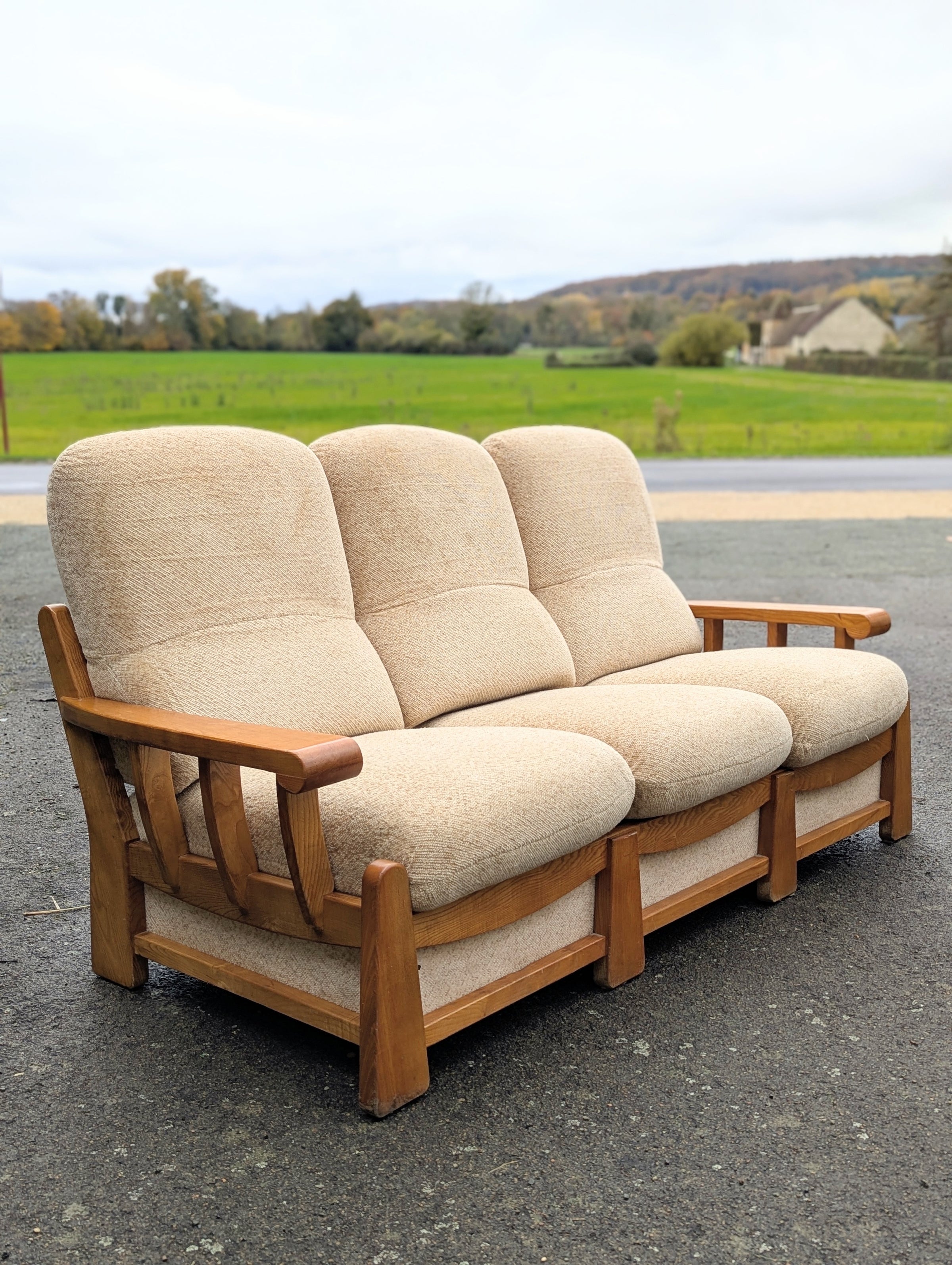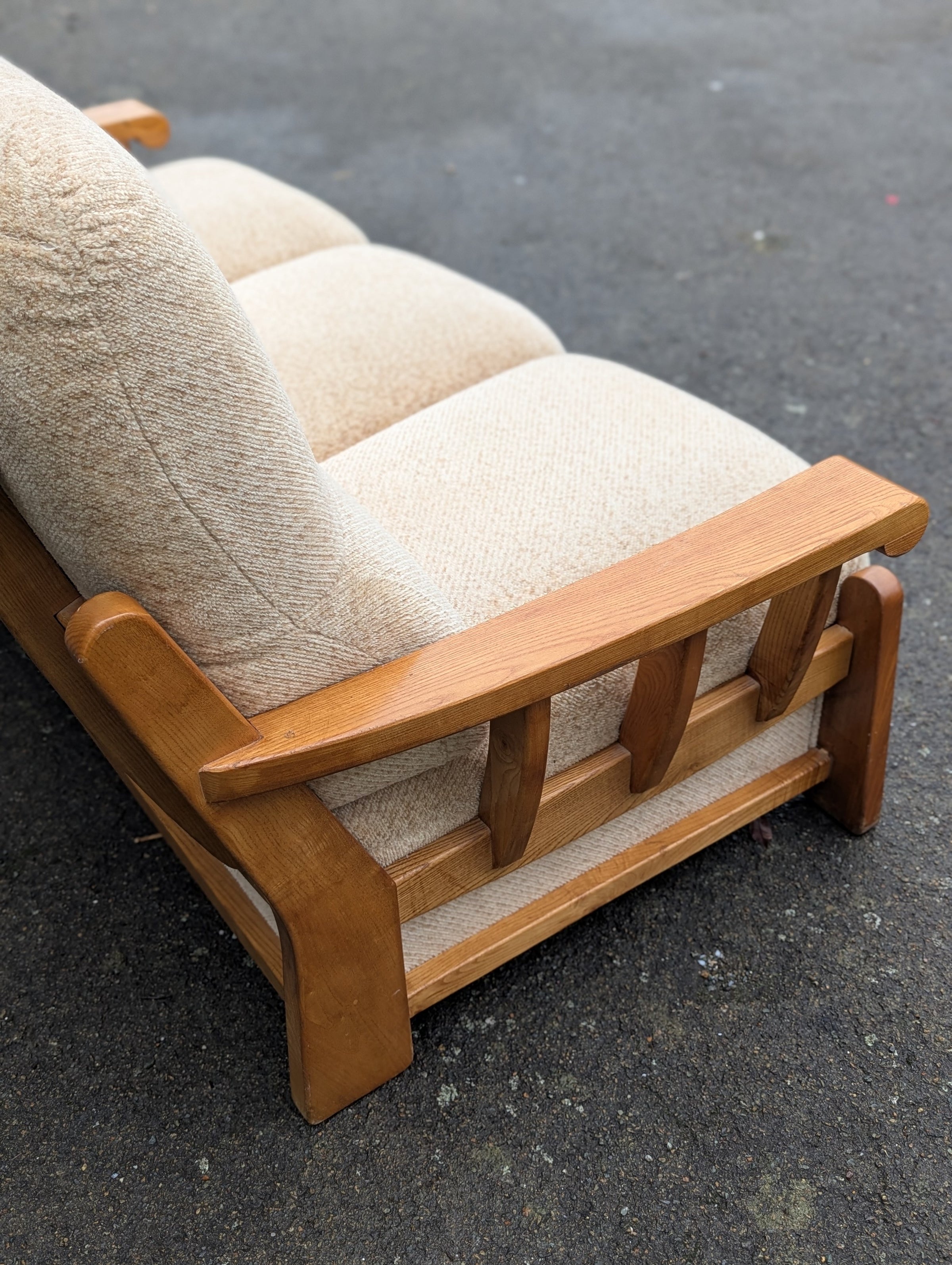Canapé convertible Maison Regain avec une ossature en orme massif en tissu d’origine style bouclette crème / beige en parfait état