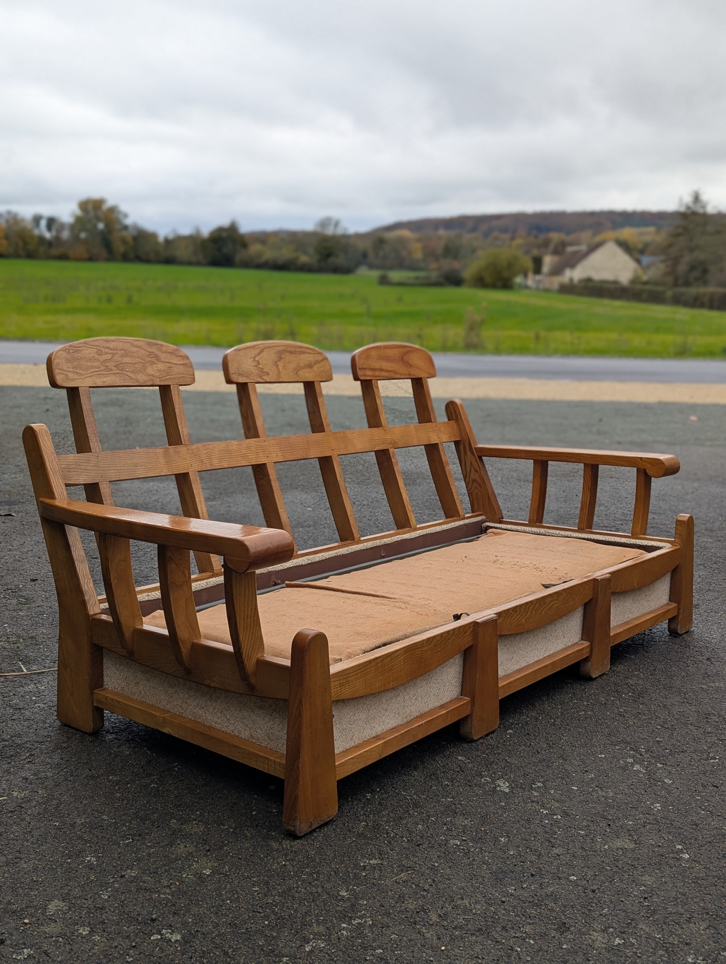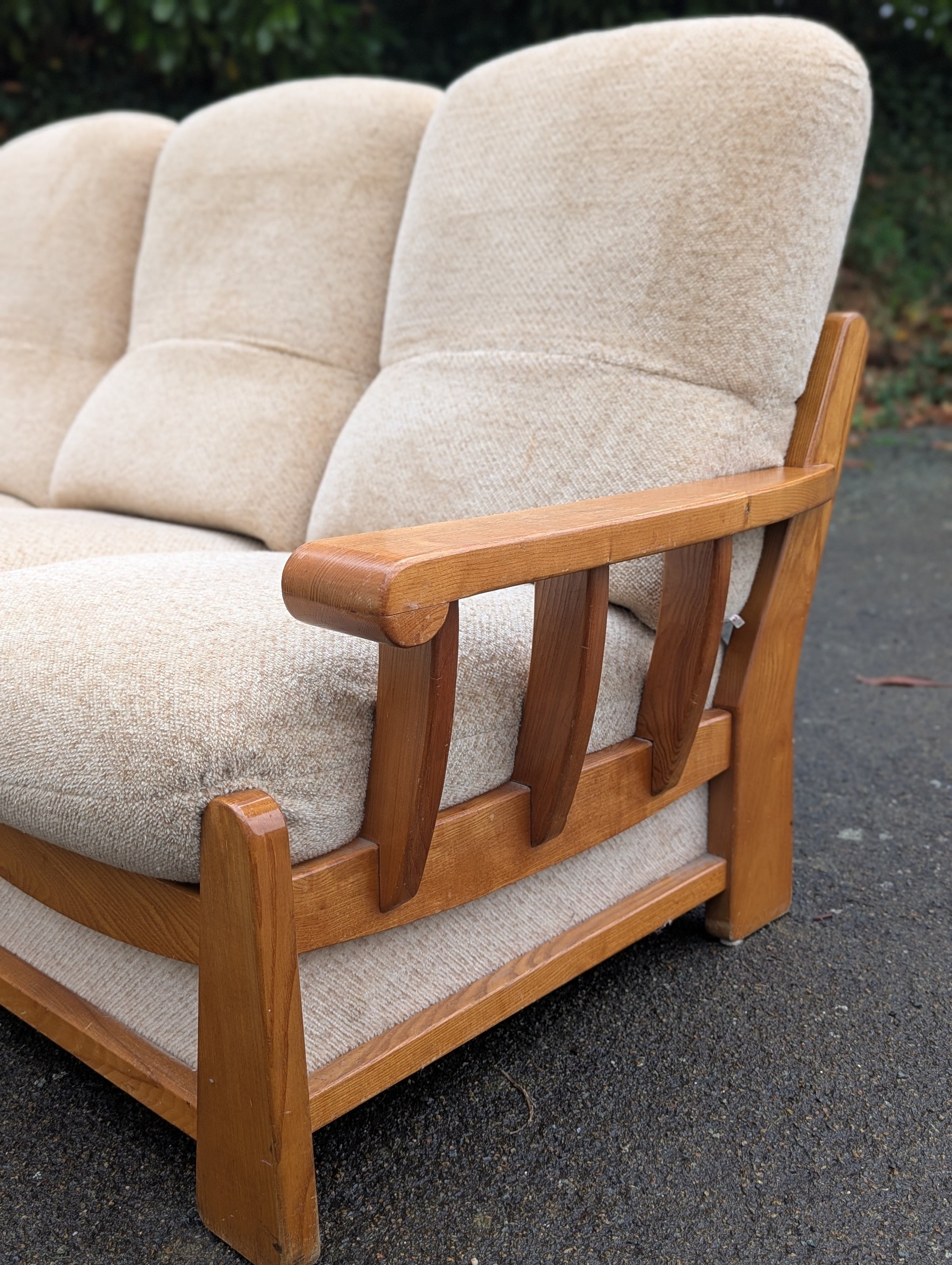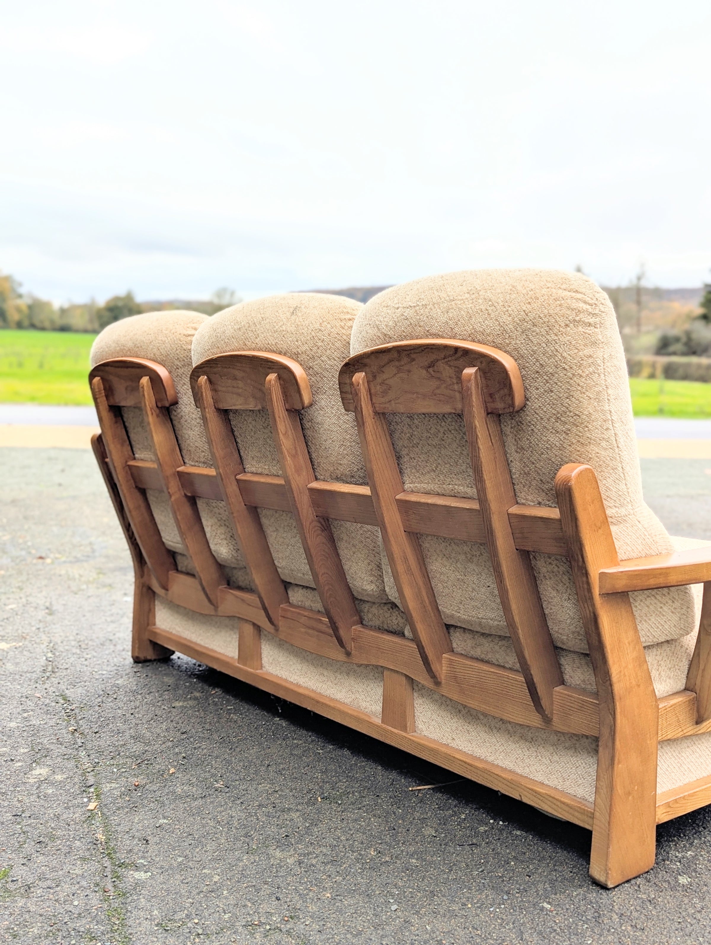 Canapé convertible Maison Regain avec une ossature en orme massif en tissu d’origine style bouclette crème / beige en parfait état