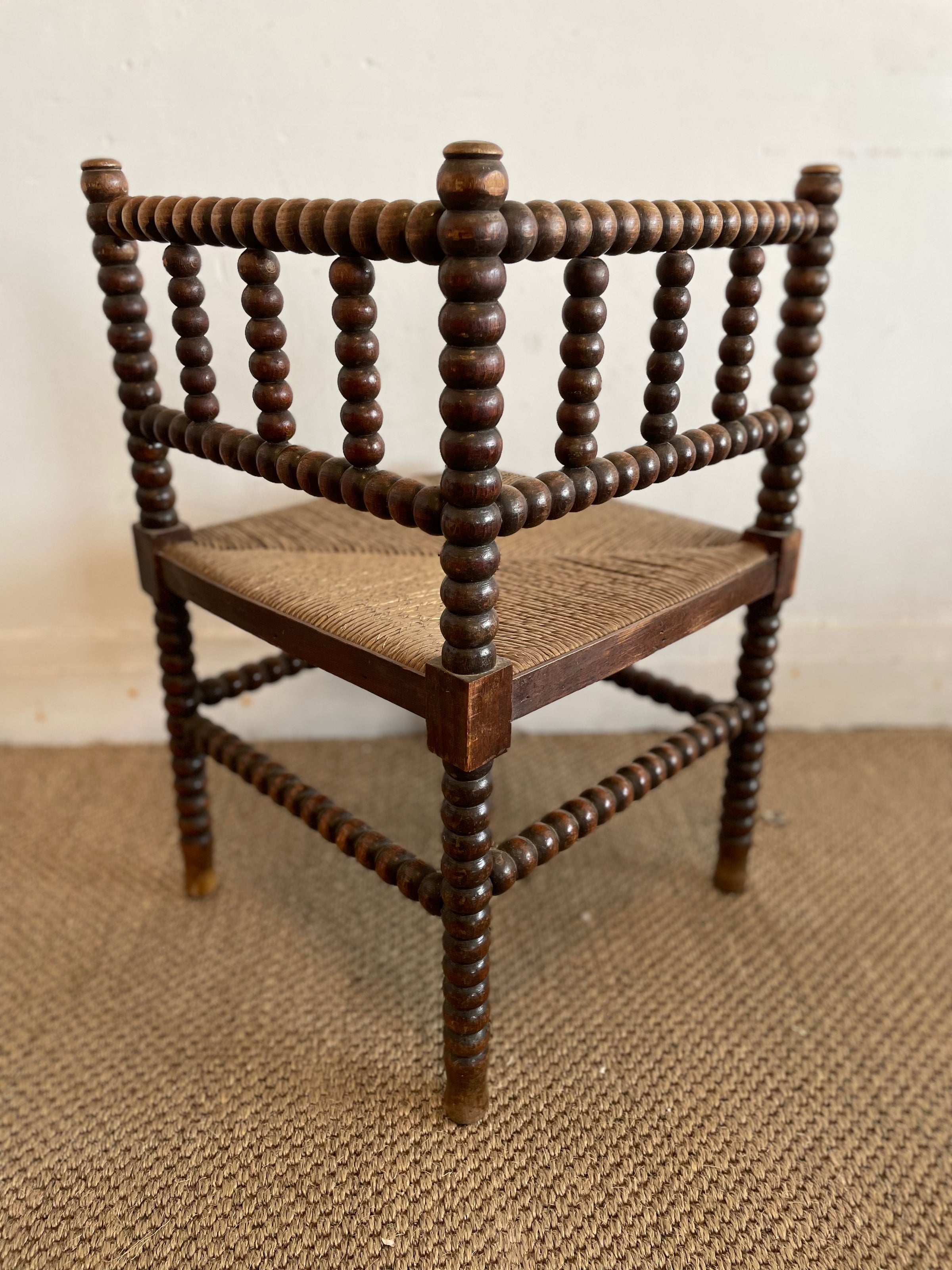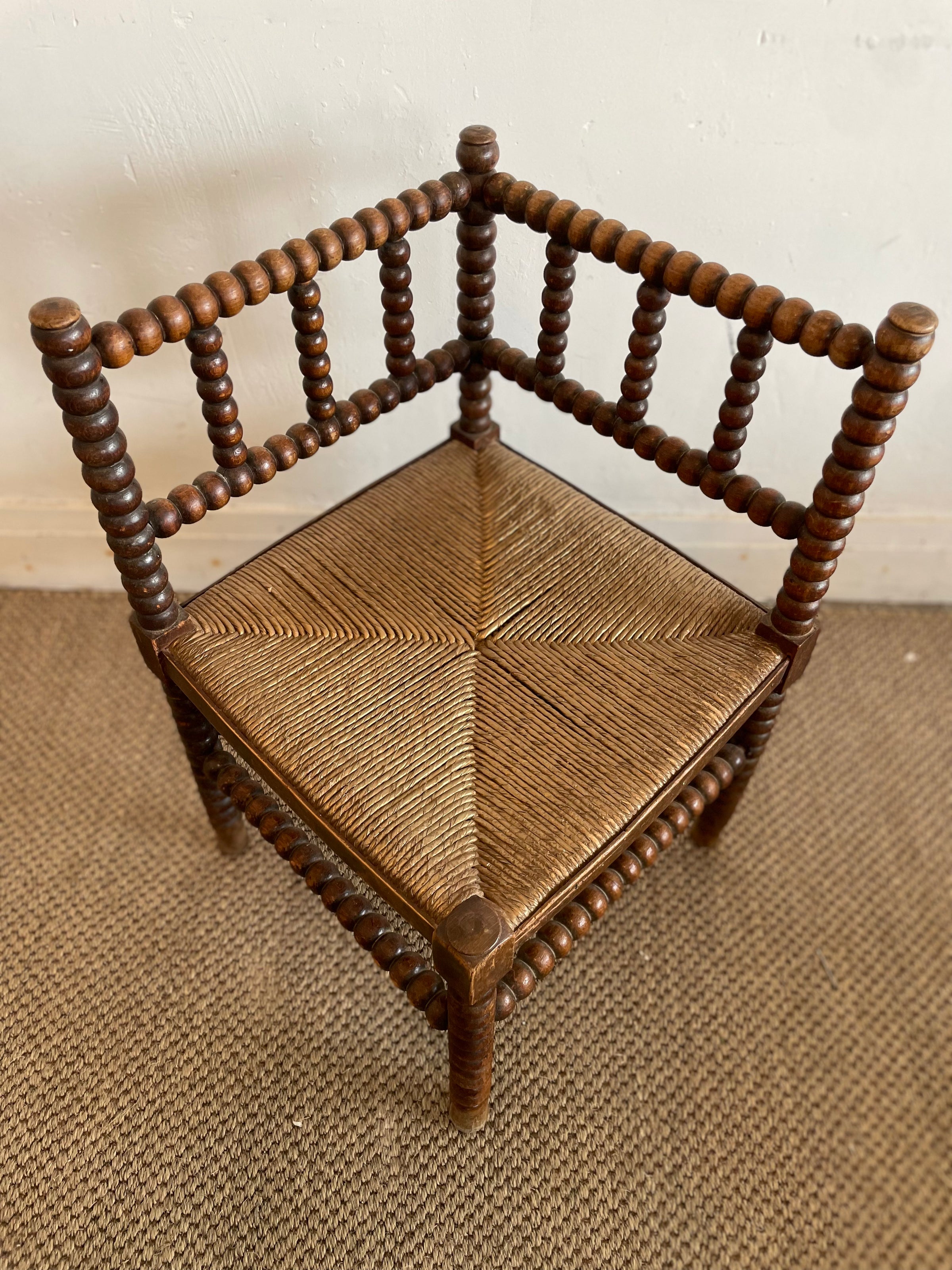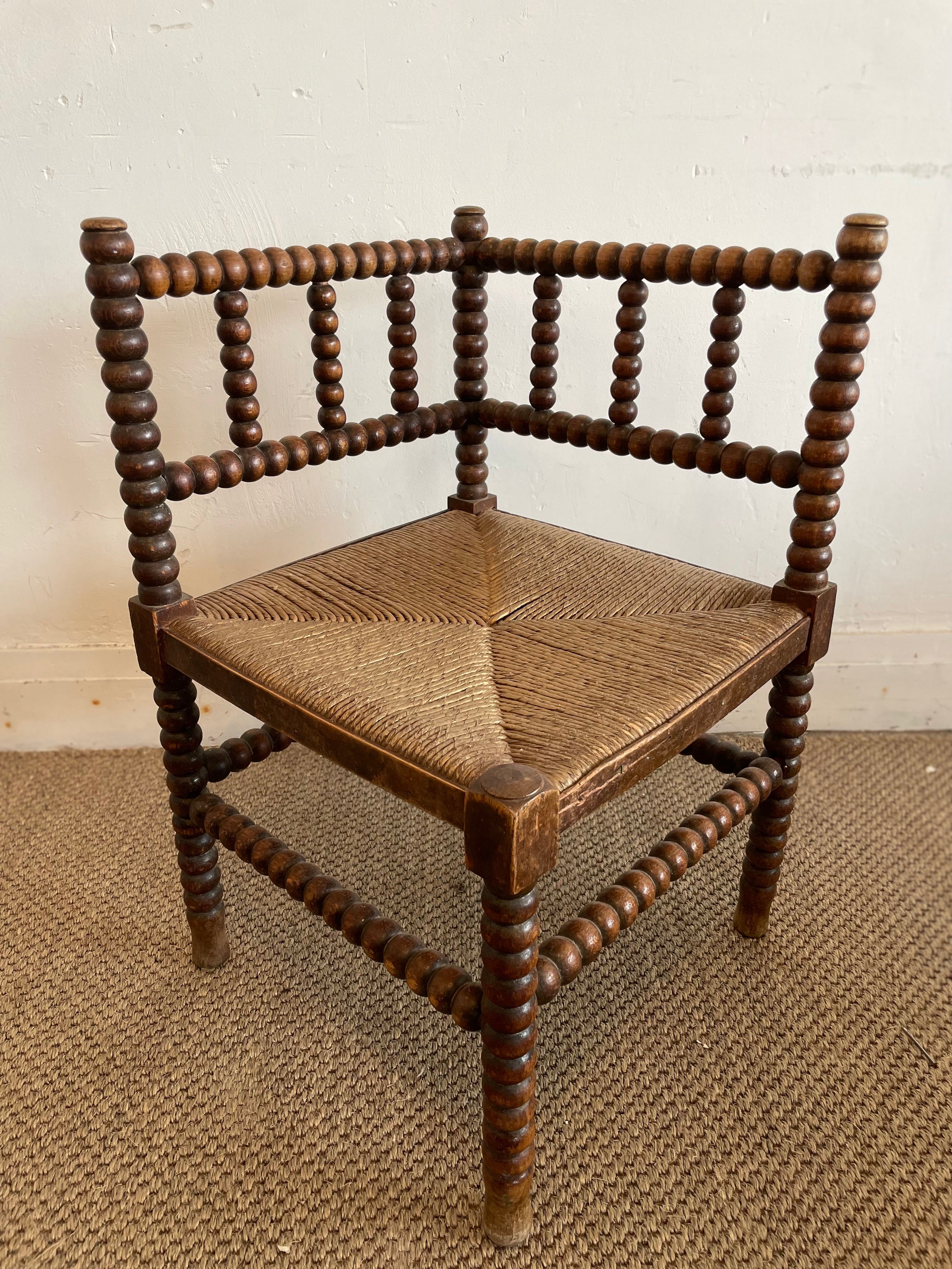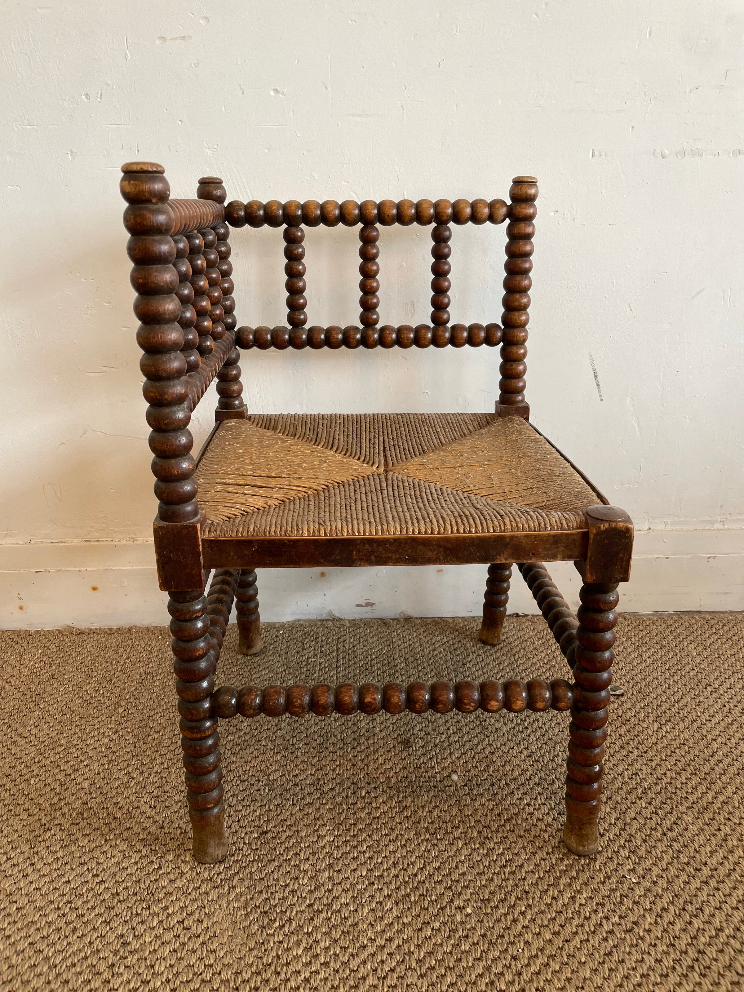 Chaise d'angle "coin de feu" en bois tourné et paillée